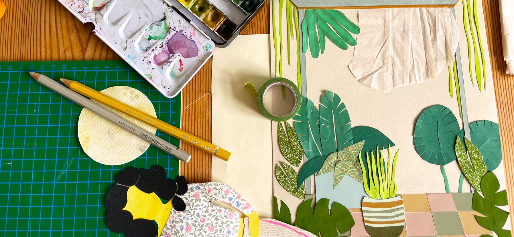 Der er mulighed for at sammensætte en collage med udklip af gamle blade, tapetrester, farvet papir, farveprøver mm. Temaet kan være en bestemt farve, en årstid, en destination mm. Man kan lave et billede til ophængning. - 18/5: Lav en lille plante/koral-skulptur